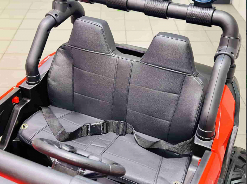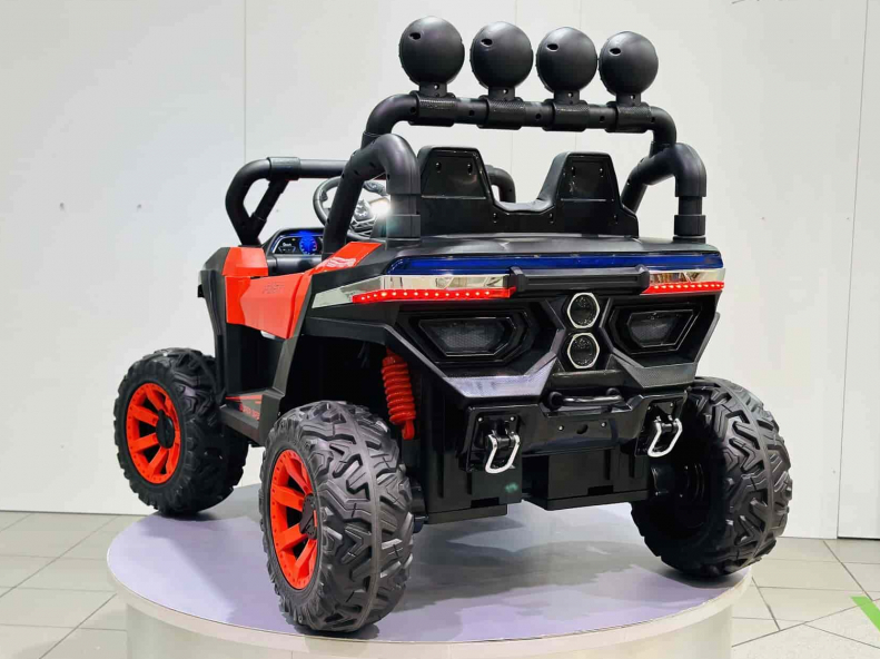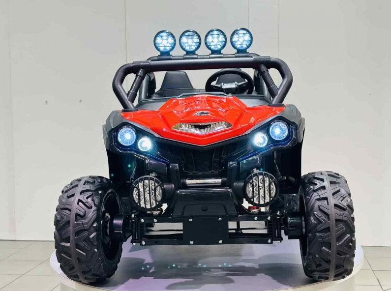 Детский электромобиль Багги — двухместный багги для 2-х детей возрастом до 4-х лет или одного ребенка до 8 лет. Автомобиль приводится в движение 4-мя двигателями мощностью 45 ватт, питаемыми от 2-х 12-ти вольтовых аккумуляторов. Мягкие каучуковые колеса (EVA-колесо) обладают высоким протектором и маневренностью. Сидение выполнено из эко кожи с 2-х точечным ремнем безопасности. На колесах установлены амортизаторы для плавного прохождения неровностей на дорогах. Спереди и сзади установлены светодиодные фары для освещения дороги в темное время суток. На руле находятся кнопки управления сигналом и переключения музыки, которую можно проигрывать с помощью встроенного аудиоплеера напрямую с вашей флешки. Для более удобной посадки в машину установлены полноценные двери.